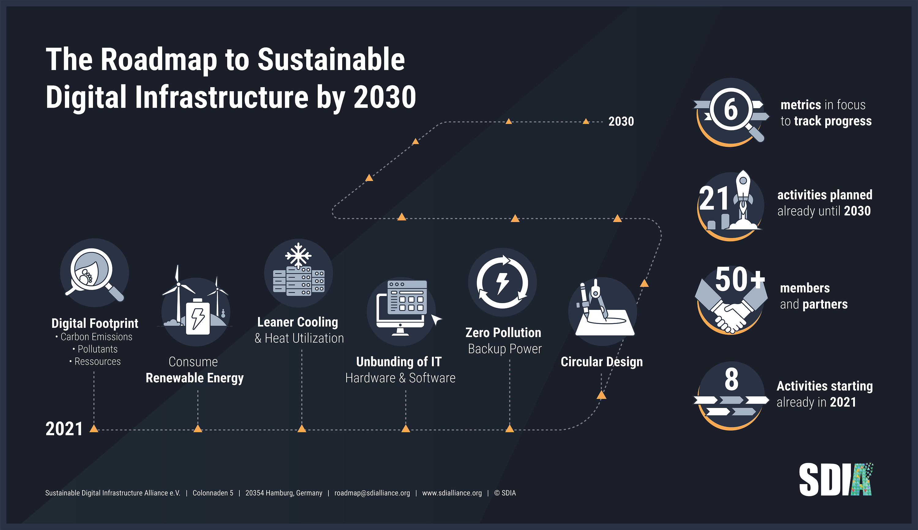 Organizations that are active in our steering groups, all have committed themselves to implementing the roadmap, within their own organizations as well as across the wider sector. Together, they form the Sustainable Digital Infrastructure Alliance, supported by a wide ranging team of experts that drive the implementation of the Roadmap.
